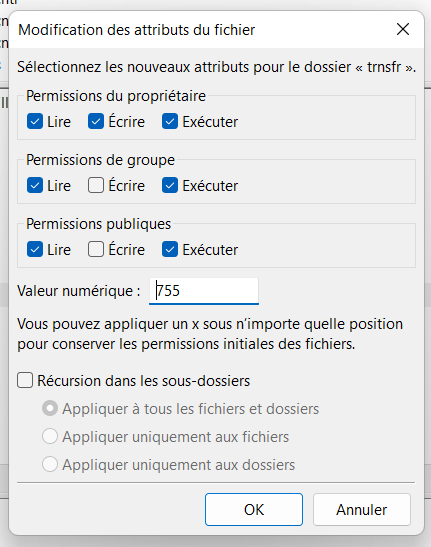 Attention, il faut s'assurer que les droits d'accès aux répertoires créés aient bien la valeur numérique 755.