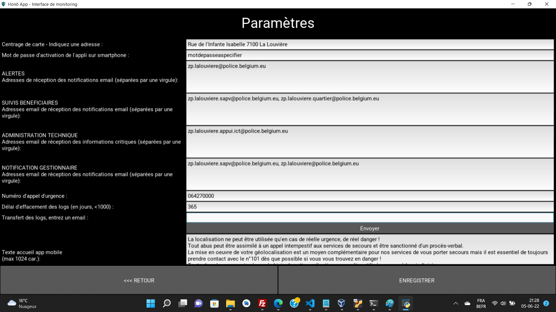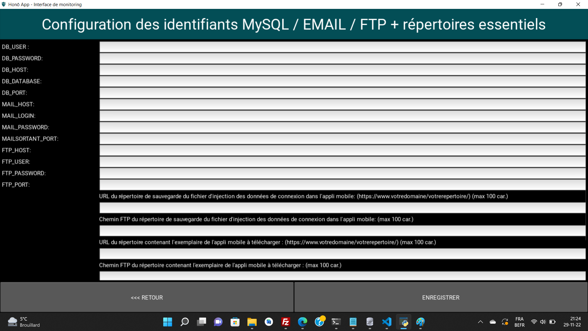 Ces champs correspondent aux différents identifiants utiles pour accéder au serveur destiné à l'exploitation de l'interface de monitoring et de l'application mobile.